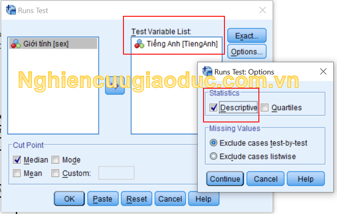 Bước 2. Trong hộp thoại Runs Test, chúng ta chuyển các biến cần kiểm tra tính ngẫu nhiên (trong trường hợp này là biến ‘TiengAnh’)vào hộp Test Variables List. Trong vùng Cut Point là các lựa chọn điểm cắt để tạo ra dữ liệu nhị phân cho kiểm định Runs test. Nếu dữ liệu là điểm số, chúng ta có thể chọn điểm cắt là Trung vị (median), Hoặc Trung bình (mean) hoặc một giá trị được thiết lập. Trong ví dụ này, chúng tôi chọn điểm cắt là median (trung bình). Nhấp vào Options, chọn Descriptive để hiển thị mô tả dữ liệu đầu ra. Cuối cùng nhấp OK để chạy kết quả.