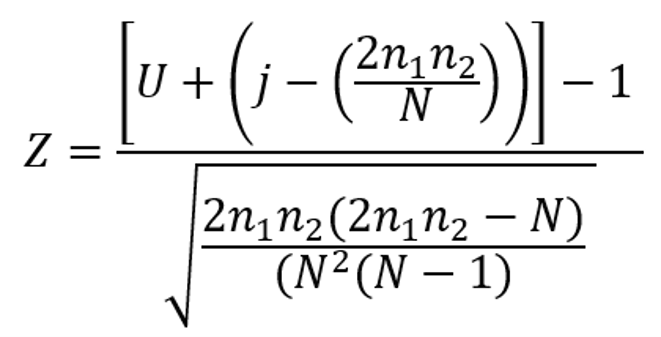 trong đó N là tổng kích thước mẫu, U là số lần chạy, n1 và n2 là tần số cho hai loại của biến đáp ứng và j là điều chỉnh cho tính liên tục trong đó nó là 0.5 nếu U <2n1n2 / (N + 1) hoặc −0,5 nếu U> 2n1n2 / (N + 1).