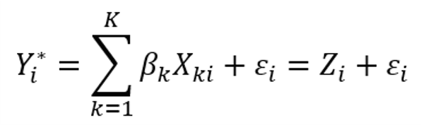 Ví dụ: có thể là nếu điểm của bạn trên biến tiềm ẩn không quan sát được, Y*, là 37 hoặc ít hơn, thì điểm của bạn trên Y sẽ là 1; nếu điểm Y* của bạn từ 37 đến 53, Y sẽ bằng 2; và nếu điểm Y* của bạn trên 53, Y sẽ bằng 3. Nói cách khác, bạn có thể coi Y là phiên bản thu gọn của Y*, ví dụ: Y* có thể nhận một phạm vi giá trị vô hạn, sau đó có thể được thu gọn thành 5 loại Y.
