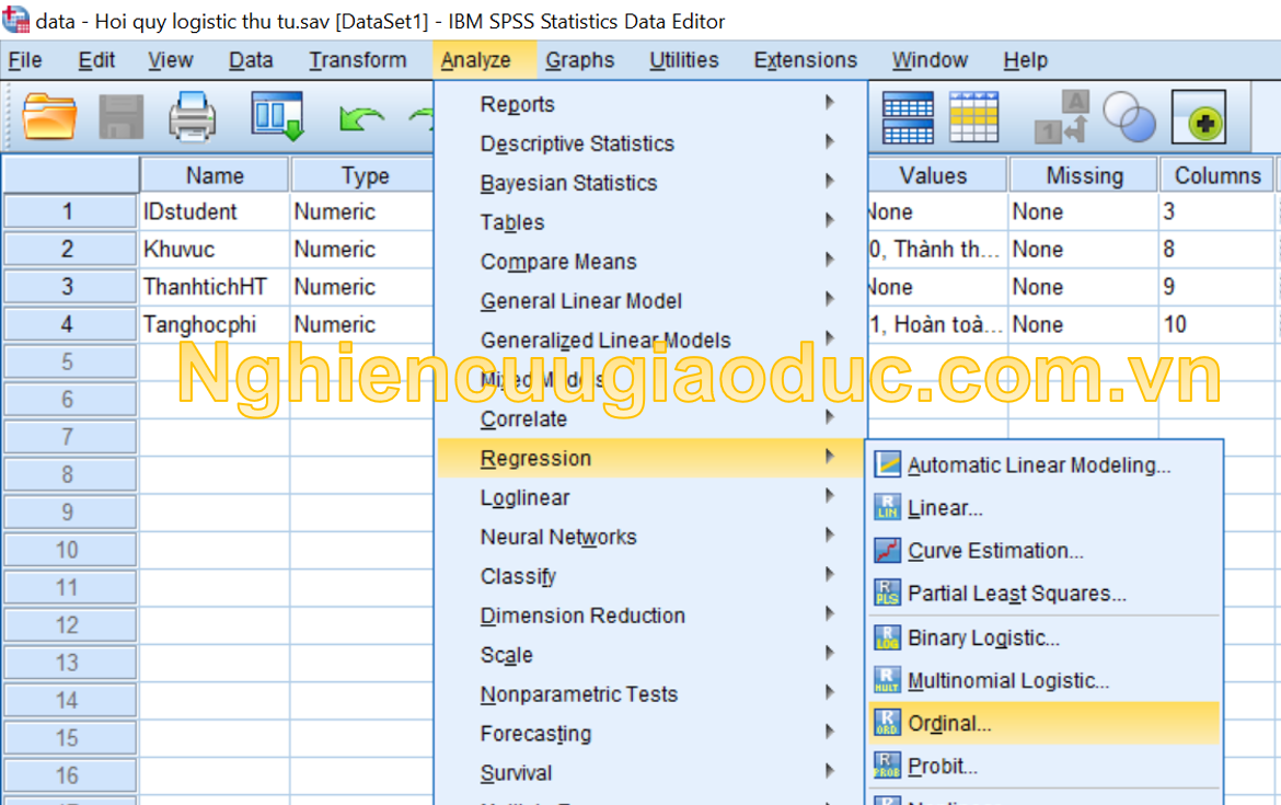 Trong SPSS, ba biến đã được tạo bao gồm (1) Biến phụ thuộc ‘Tanghocphi’ có 5 mục được xếp hạng, 1=hoàn toàn không đồng ý, 2=không đồng ý, 3=trung lập, 4=đồng ý, 5=đồng ý mạnh mẽ; (2) Biến độc lập ‘Khuvuc’ có 2 danh mục, 0=thành thị, 1=nông thôn; (3) Biến độc lập ‘ThanhtichHT’ là biến liên tục, được nhập giá trị trực tiếp.