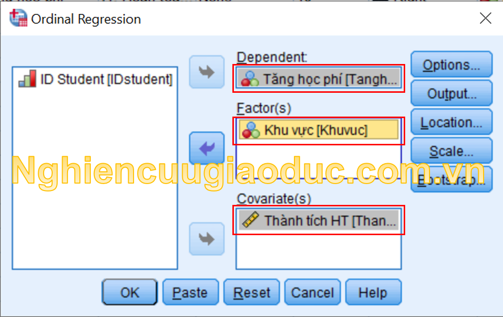Bước 2: Trong hộp thoại Ordinal Regression, chúng ta chuyển biến phụ thuộc ‘Tanghocphi’ vào ô Dependent, chuyển biến độc lập liên tục ‘ThanhtichHT’ vào Covariate(s), chuyển biến giới tính ‘Khuvuc’ vào ô Factor(s).