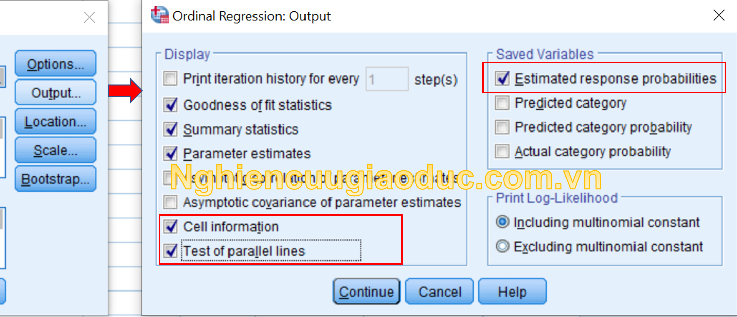 Bước 3: Nhấp vào nút Output, đánh dấu vào ô Cell Information, Test of Parallet lines. Điều này là cần thiết vì nó sẽ yêu cầu SPSS thực hiện kiểm tra giả định về Odds về tỷ lệ (hoặc các đường song song) nằm trong mô hình hồi quy thứ tự. Bạn cũng co thể đánh dấu thêm vào ô Estimated response probabilities. Điều này sẽ lưu, đối với mỗi trường hợp trong tệp dữ liệu, xác suất dự đoán để đạt được từng loại kết quả, trong trường hợp này là xác suất ước tính của sinh viên đạt được từng cấp độ phản ứng với tăng học phí. Các nút khác giữ nguyên mặc định như trong hình dưới đây. Sau đó nhấp Continue.