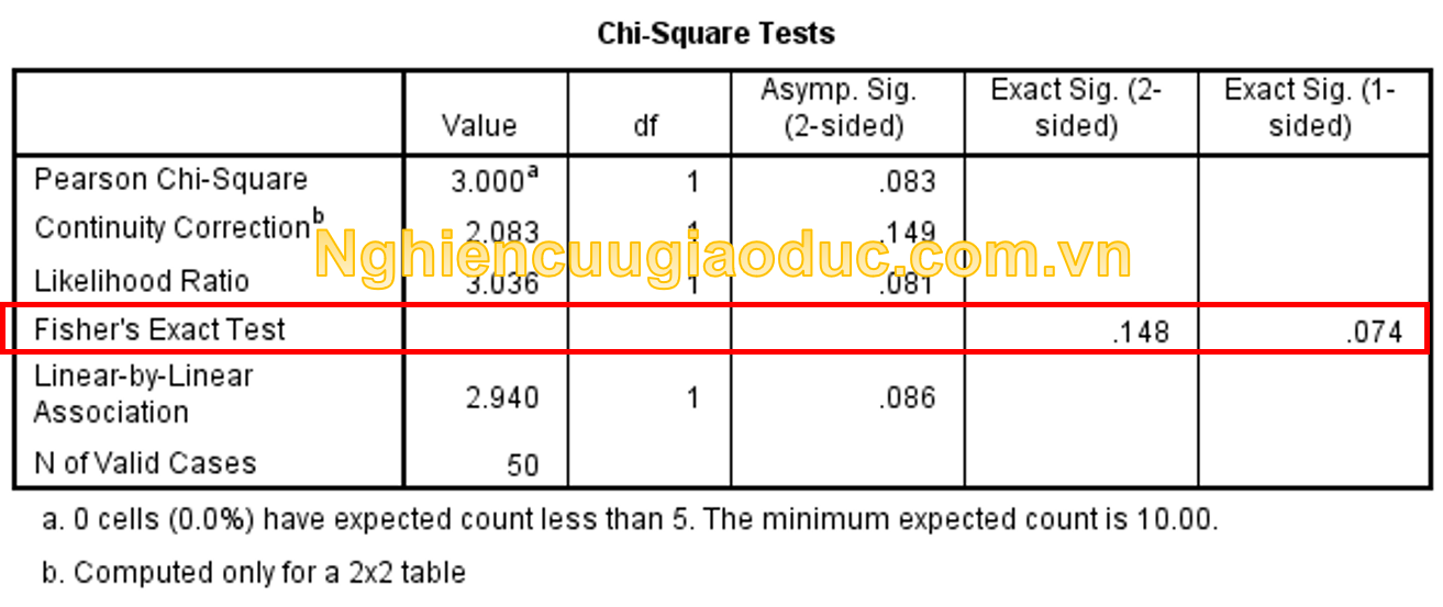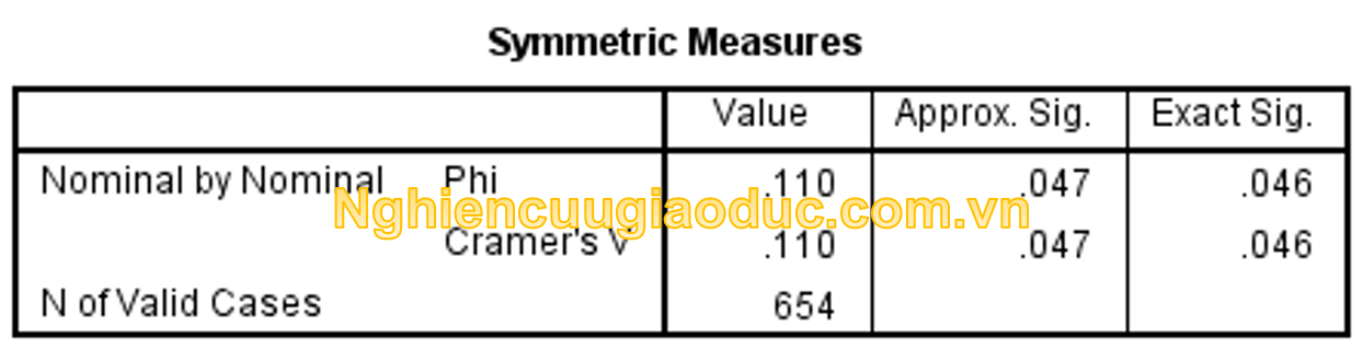 Bảng Chi-Square Tests cung cấp các thông tin quan trọng nhất, kết quả Fisher Exact sẽ có sự khác biệt đôi chút so với kiểm tra χ2.