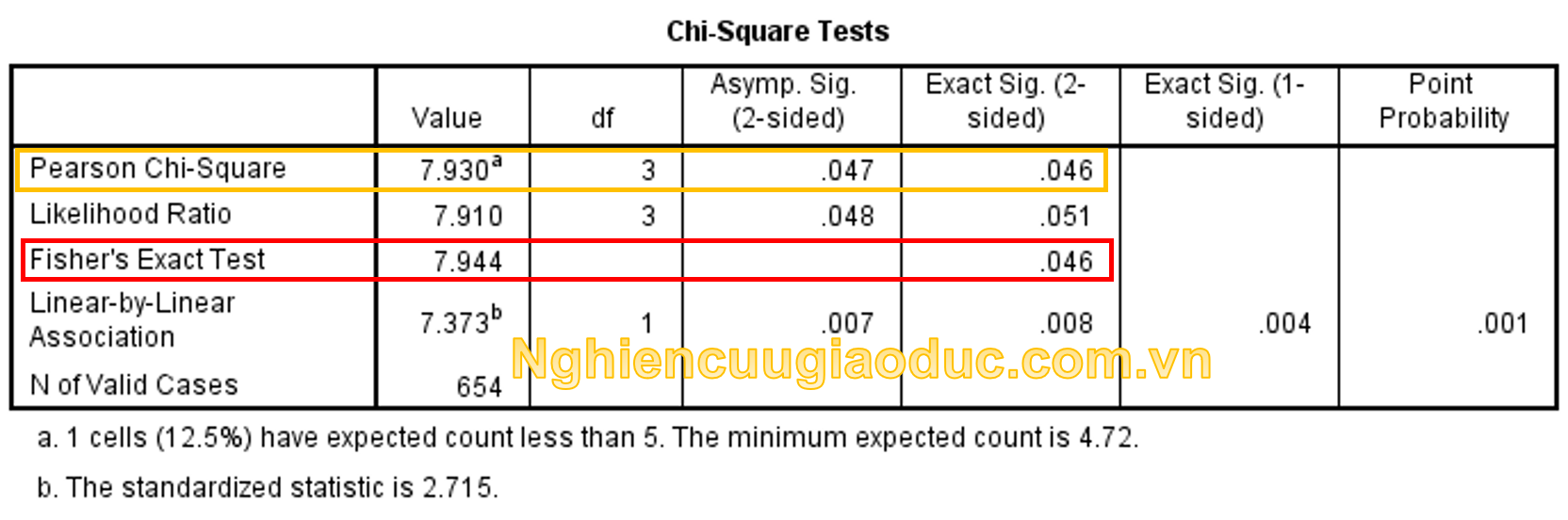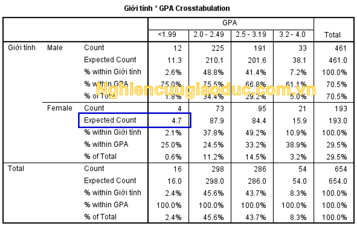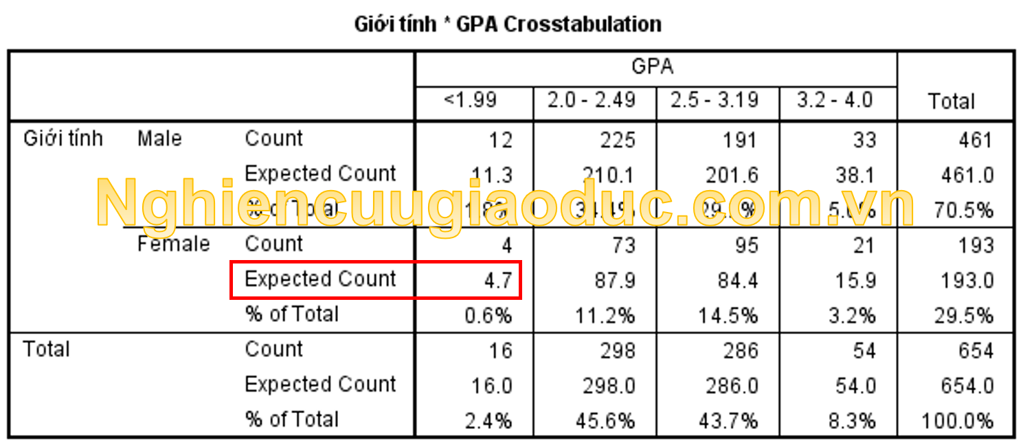 Trong bảng CrossTabs về tần suất bảng 2×4 giữa giới tính và GPA của 654 sinh viên cho thấy ô giá trị kì vọng của sinh viên nữ tương ứng GPA <1.99 bằng 4.7 (tức là nhỏ hơn 5). Khi đó chúng ta cần sử dụng kiểm định Fisher Exact.