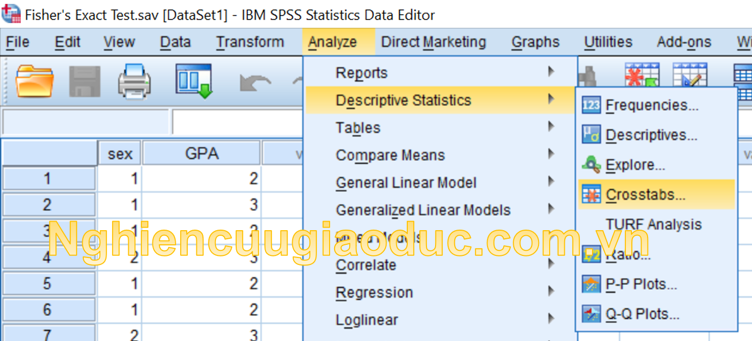 Bước 1. Vào Analyze > Descriptives Statics > CrossTabs…