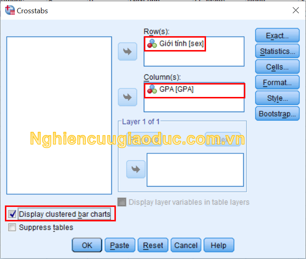 Bước 2. Tại cửa sổ CrossTabs, chúng ta đưa biến giới tính (sex) vào ô Row(s), biến GPA vào ô Column(s). Chúng ta có thể chọn Display Clustered bar charts nếu muốn hiển thị biểu đồ kết quả.