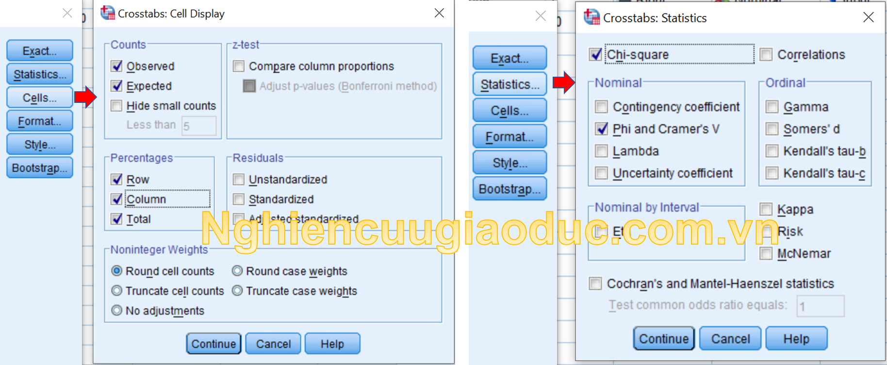 Bước 3. Các thiết lập khác ở nút Statistics và Cells thực hiện như kiểm tra χ2. Sau khi thiết lập ở mỗi nút, chúng ta bấm Continue.