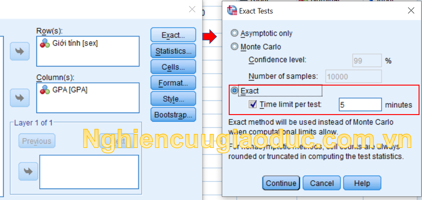– Trong trường hợp một bảng lớn hơn (chẳng hạn 2×5), nhưng cỡ mẫu nhỏ hoặc tần suất kì vọng của ít nhất 1 ô nhỏ hơn 5 thì khi đó chúng ta cần thực hiện kiểm định Fisher Exact có nút Exact. Trong Exact, hai kỹ thuật được sử dụng bổ sung là Exact và Monte Carlo để đưa ra ý nghĩa thống kê. Nếu sử dụng Monte Carlo, chúng ta cần nhập độ tin cậy và số mẫu được sử dụng trong tính toán. Kỹ thuật Monte Carlo cho kết quả nhanh hơn so với Exact. Nếu sử dụng kỹ thuật Exact, chúng ta cần xác định thời gian tối đa mỗi phép tính toán. Nếu thời gian này trên 30 phút thì nên sử dụng Monte Carlo. Trong phần dưới đây sẽ hướng dẫn thực hiện kiểm tra Fisher Exact.