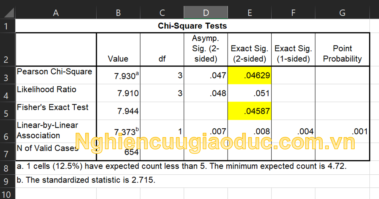 – Mức ý nghĩa Sig. (2-sided) ở hai phương pháp (χ2 và Fisher Exact) là không có sự chênh lệch trong SPSS (p=.46) do giới hạn làm tròn 2 số thập phân và cỡ mẫu lớn. Tuy nhiên, khi copy dữ liệu sang Excel và mở rộng số thập phân chúng ta thấy rõ mức ý nghĩa của kiểm định Fisher Exact (p=.4587) là thấp hơn so với mức ý nghĩa của χ2 (p=.4629).