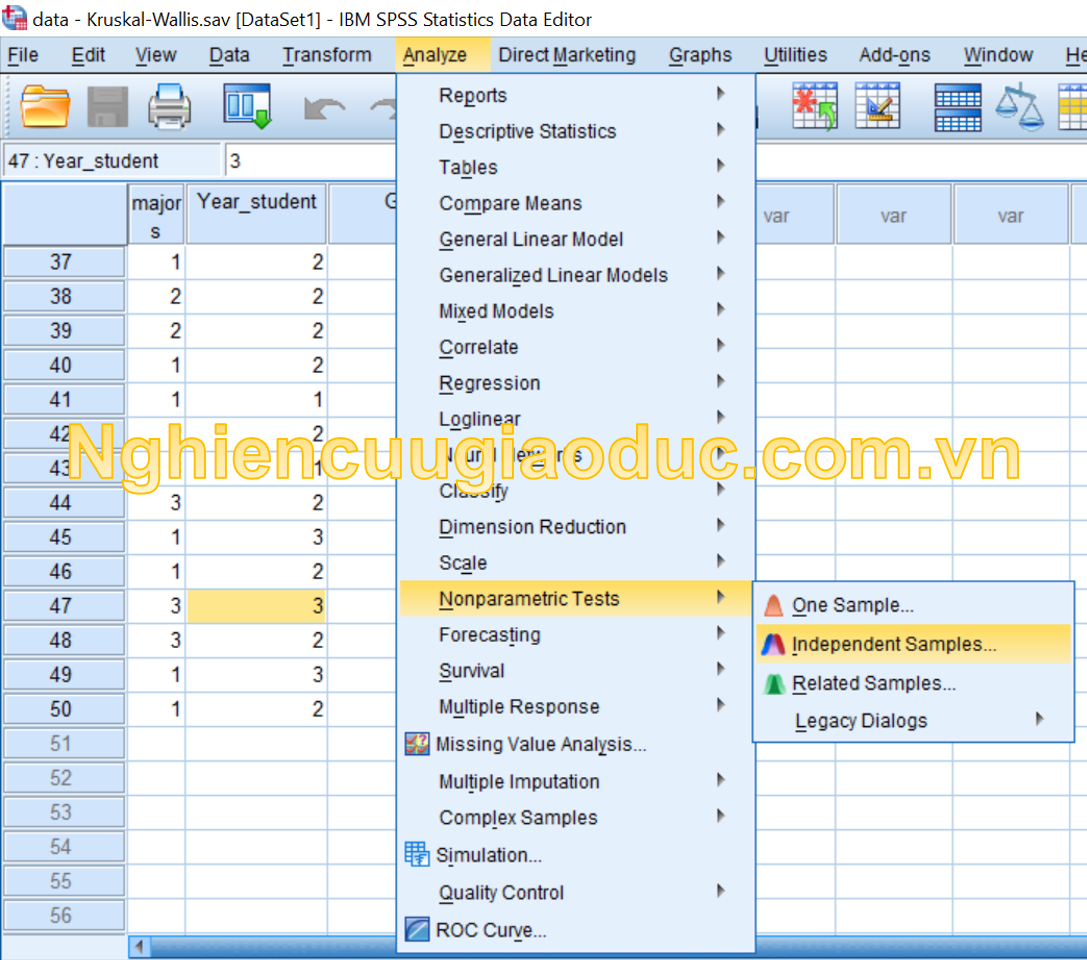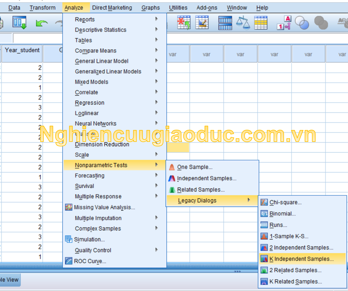 Các bước chạy Kruskal-Wallis One-way ANOVA trong SPSS như sau: