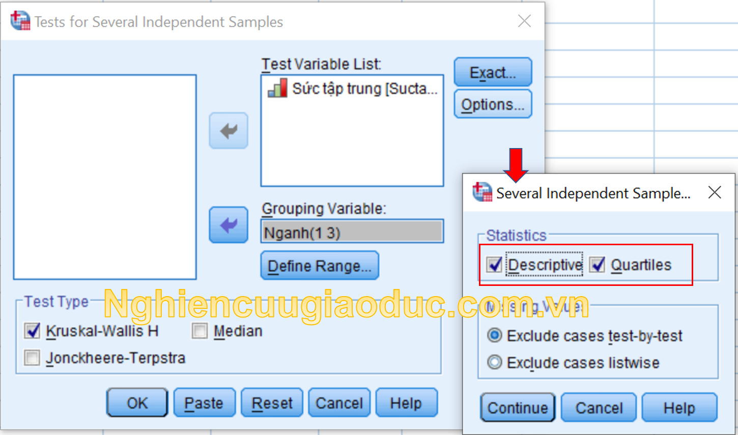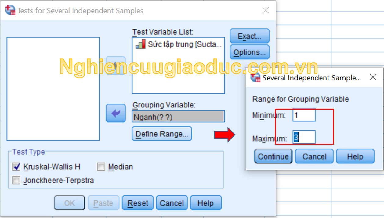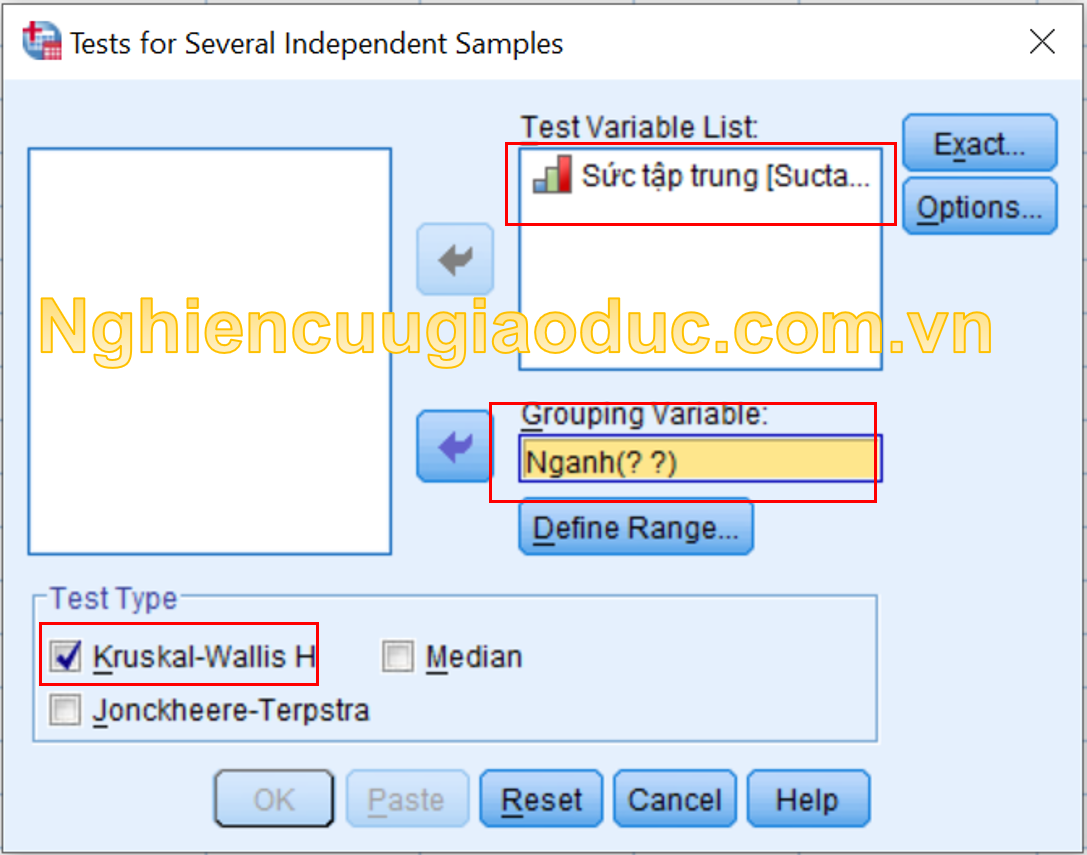 Bước 2. Trong hộp thoại Tests for Several Independent Samples, chúng ta nhấp vào box Kruskal trong vùng Test Type. Sau đó chúng ta đưa biến phụ thuộc (trong ví dụ này là Suctaptrung) vào hộp Test Variables List. Trong vùng Grouping Variable, chúng ta đưa biến độc lập (trong ví dụ là ngành sinh viên – Nganh).