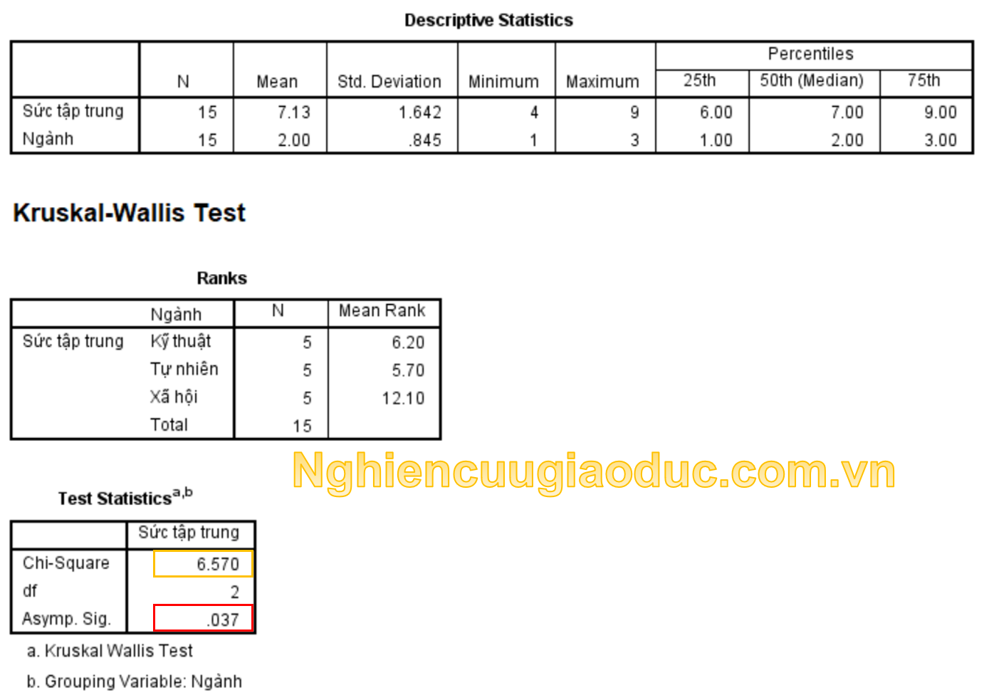 Bảng thống kê kiểm tra (Test Statistics) cung cấp thống kê giá trị xấp xỉ χ2, cũng như giá trị xác suất p tiệm cận có ý nghĩa – Asymp. Sig. Giá trị p =0.037 < 0.05 cho thấy giả thuyết vô hiệu không bị bác bỏ ở mức 5%. Tra bảng phân phối χ2, giá trị χ2 thu được là 6.570 với bậc tự do df = 2, lớn hơn giá trị tới hạn χ2 bằng 5.99147 (ở mức ý nghĩa 5%). Chúng ta kết luận rằng có đủ bằng chứng về sự khác biệt giữa ba nhóm sinh viên (kỹ thuật, tự nhiên và xã hội) về hiệu ứng của Thiền để cải thiện sức tập trung học tập (χ2=6.570, p=.037).