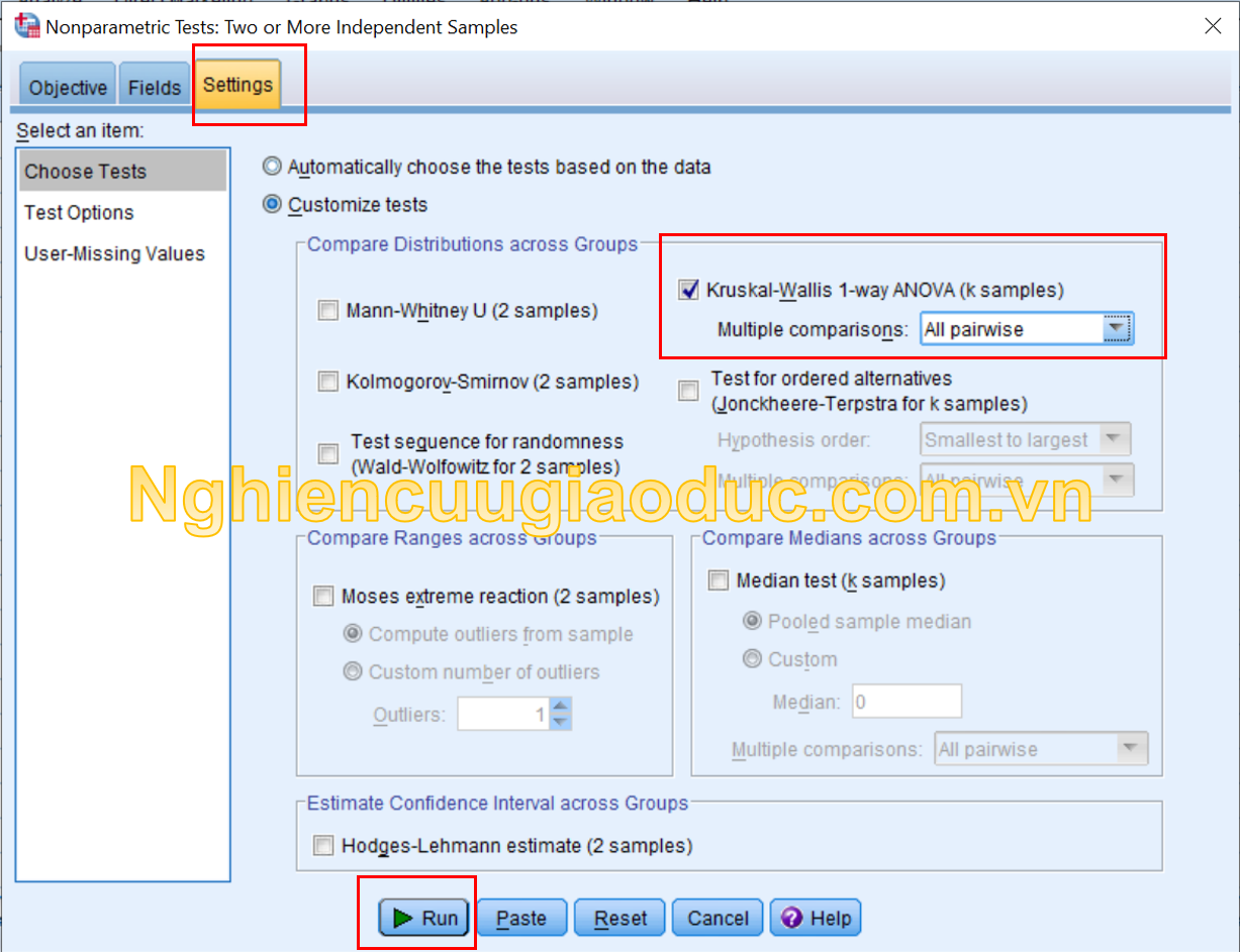 – Bước 3:Trong tab Settings, chọn Customize tests và sau đó chọn bài kiểm tra Kruskal-Wallis. Để so sánh nhiều Multiple Comparisons là All pairwise. Sau đó nhấn ‘Run’.