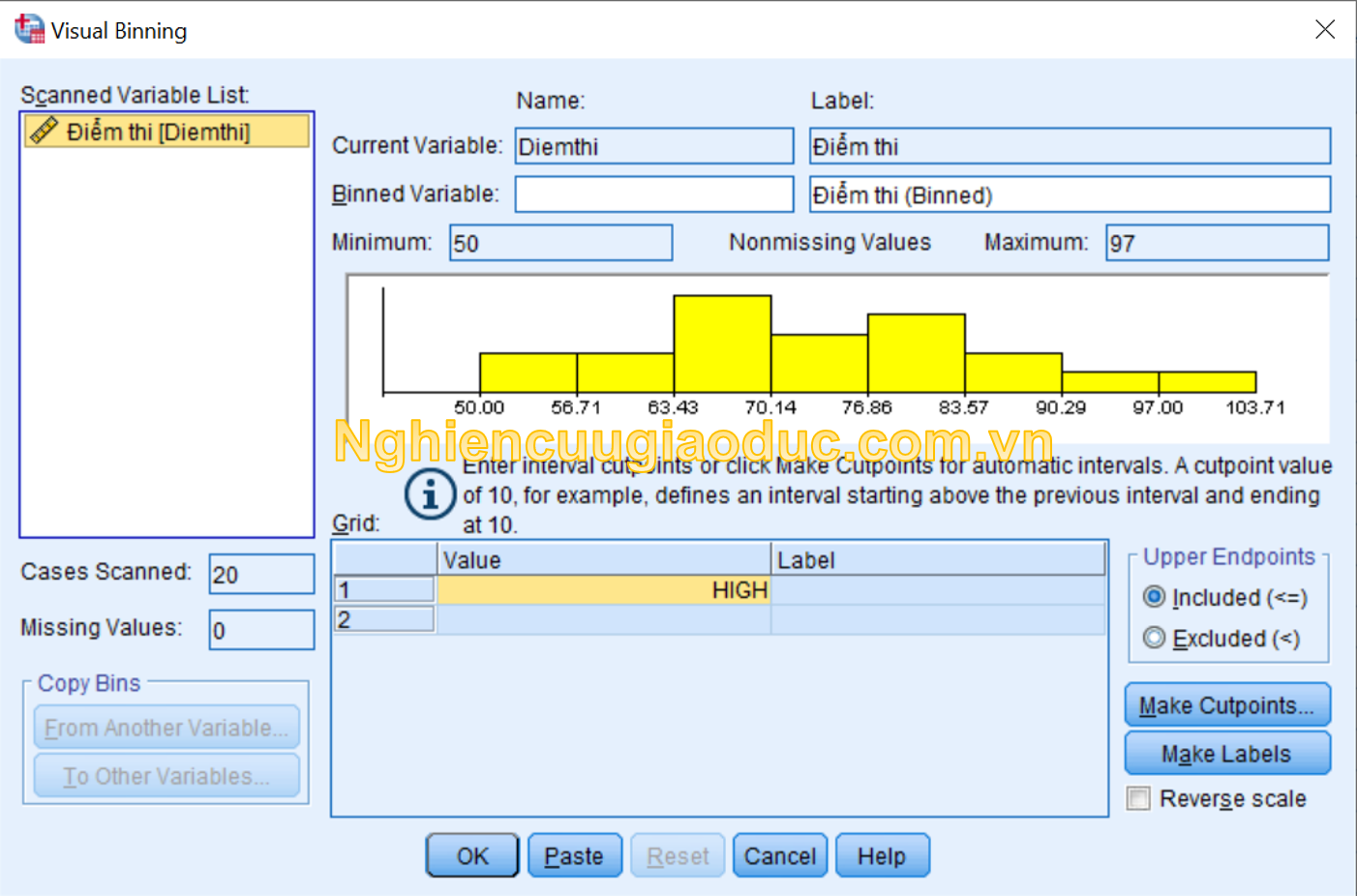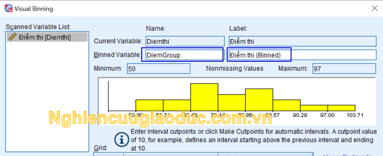 – Bước 2: Đặt tên (name) cho biến ngăn trong ô binned variable, trong ví dụ này chúng ta có thể đặt tên biến là DiemGroup. Nhãn Label được SPSS tự động đặt ra là Điểm thi (Binned), chúng ta có thể giữ nguyên.