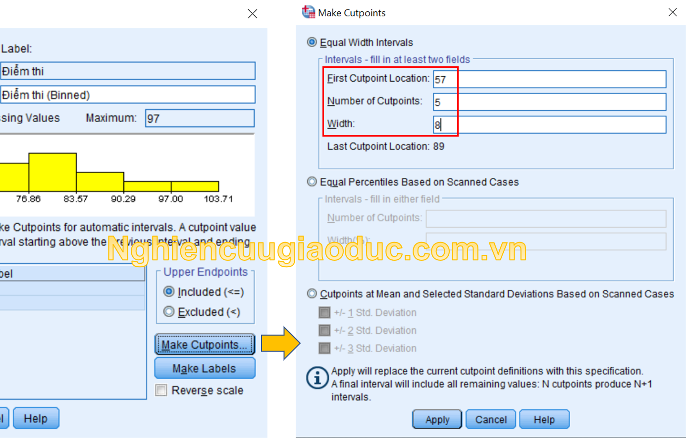 – Bước 3: Thiết lập khoảng lớp. SPSS đã cung cấp trước một điểm cắt, HIGH (ngụ ý đây là lớp cuối). Để tạo khoảng lớp, bạn chọn Make Cutpoints để mở hộp thoại Make Cutpoints. Trong ô First Cutpoint Location, chúng ta nhập một giá trị cắt trên của khoảng lớp thấp nhất, trong ví dụ này mức trên của khoảng lớp thấp nhất là 57. Trong ô Width (độ rộng của khoảng lớp), chúng ta nhập là 8 theo giá trị tính toán trong ví dụ. Giá trị của ô Number of Cutpoints sẽ được tự động tính số lượng điểm cắt là 5 để tạo ra (5+1)=6 khoảng lớp (số nhóm).