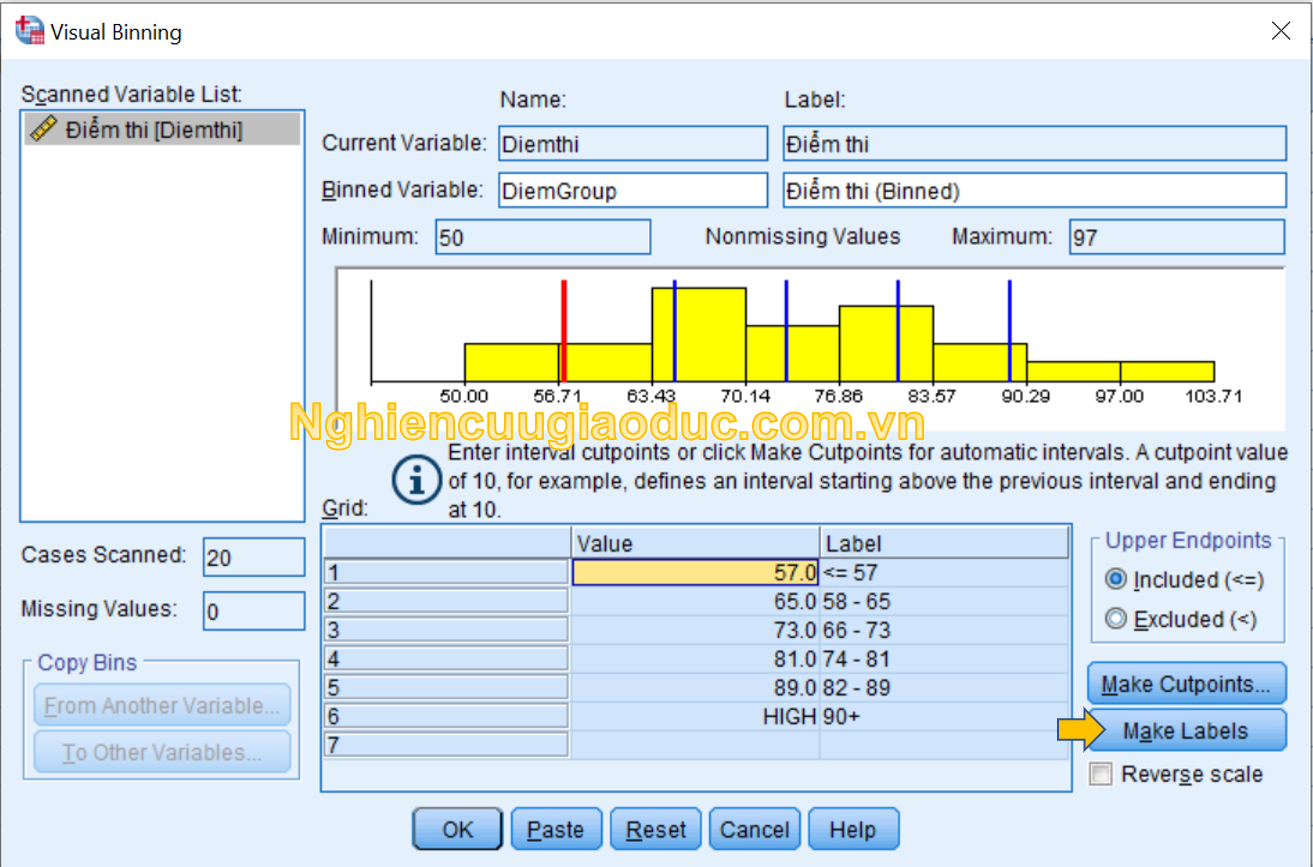 Sau đó nhấp Apply. Tại hộp thoại Visual Binning, bạn nhấp nút Make Labels để tạo nhãn của các khoảng lớp.