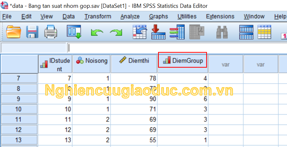 – Bước 4: Cuối cùng, nhấp OK. Một biến DiemGroup mới được tạo ra trong vùng nhập dữ liệu SPSS.