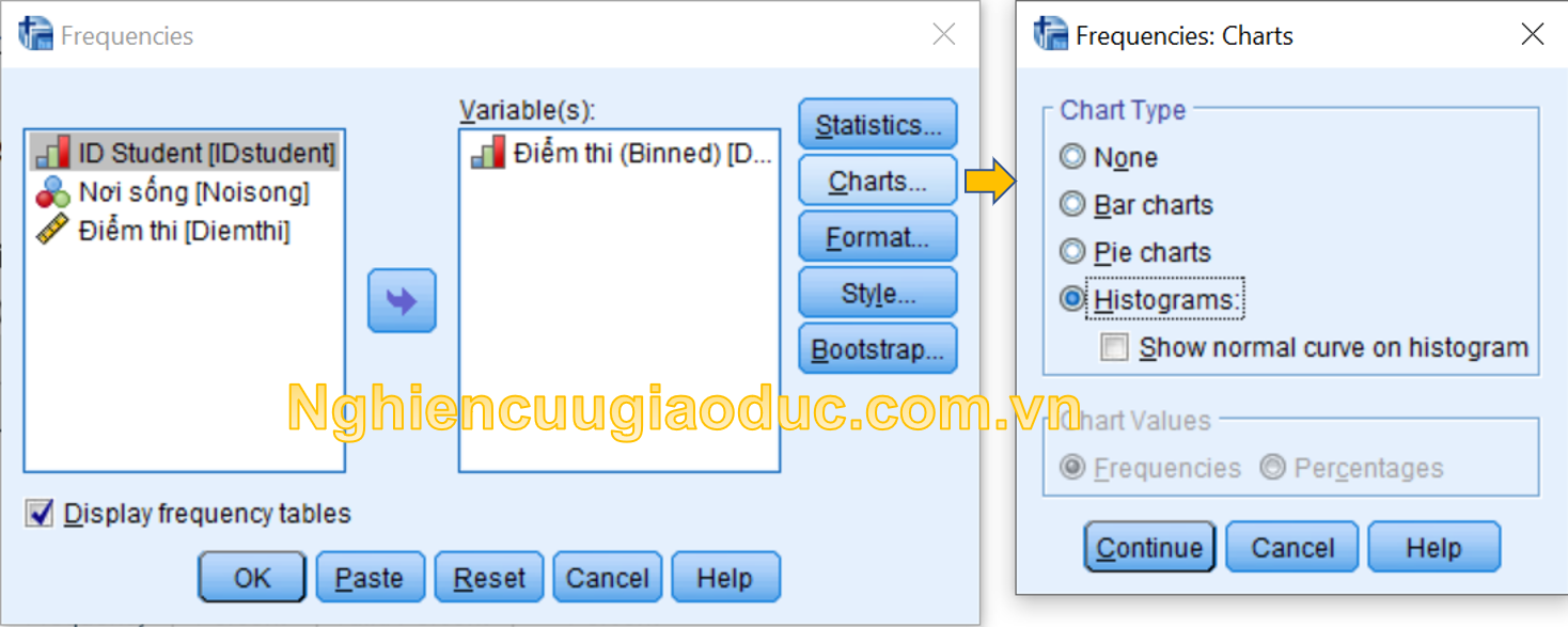 Bây giờ, chúng ta vào Anylyze > Descriptive Statistics > Frequencies… Di chuyển biến DiemGroup vào ô Variable(s), Nhấp vào Chart, chọn Histograms. Sau đó nhấp Continue, và nhấp OK để chạy kết quả.