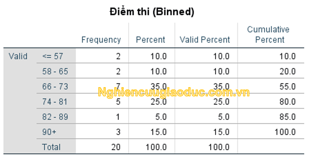 Trong bảng phân phối được nhóm gộp này, nhìn lướt qua bảng cho thấy có 20 quan sát, giá trị điểm số nhỏ nhất sẽ nằm trong khoảng lớp 50-57 và giá trị lớn nhất được tìm thấy trong khoảng 90-97. Bạn cũng có thể thấy rằng tỷ lệ sinh viên lớn nhất, 35%, nằm trong khoảng điểm từ 66-73.