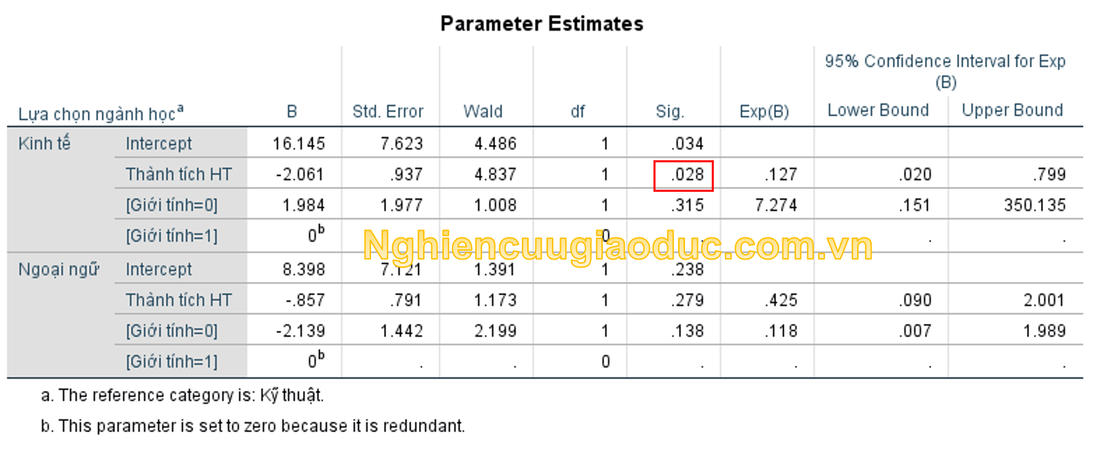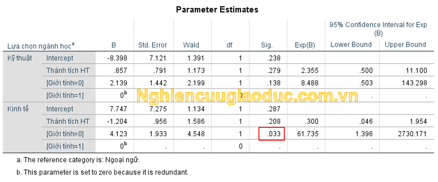 Bảng này trình bày các ước lượng tham số (còn được gọi là các hệ số của mô hình). Như bạn có thể thấy, mỗi biến giả (dummy variable) có một hệ số cho biến ‘Giới tính’. Tuy nhiên, đó không là giá trị ý nghĩa thống kê tổng thể. Điều này đã được trình bày trong bảng trước (tức là bảng Likelihood Ratio Tests). Vì có hai loại của biến phụ thuộc, bạn có thể thấy rằng có hai bộ hệ số hồi quy logistic (đôi khi được gọi là hai logit). Tập hợp hệ số đầu tiên được tìm thấy trong hàng “Kỹ thuật” (đại diện cho sự so sánh của mục ‘Kỹ thuật’ với danh mục tham chiếu ‘Ngoại ngữ’). Bộ hệ số thứ hai được tìm thấy trong hàng “Kinh tế” (đại diện cho sự so sánh của mục ‘Kinh tế’ với mục tham chiếu ‘Ngoại ngữ’). Bạn có thể thấy rằng biến “ThanhtichHT” cho cả hai bộ hệ số là không có ý nghĩa thống kê (p = .279 và p = .208, tương ứng với giá trị tại cột “Sig.“).