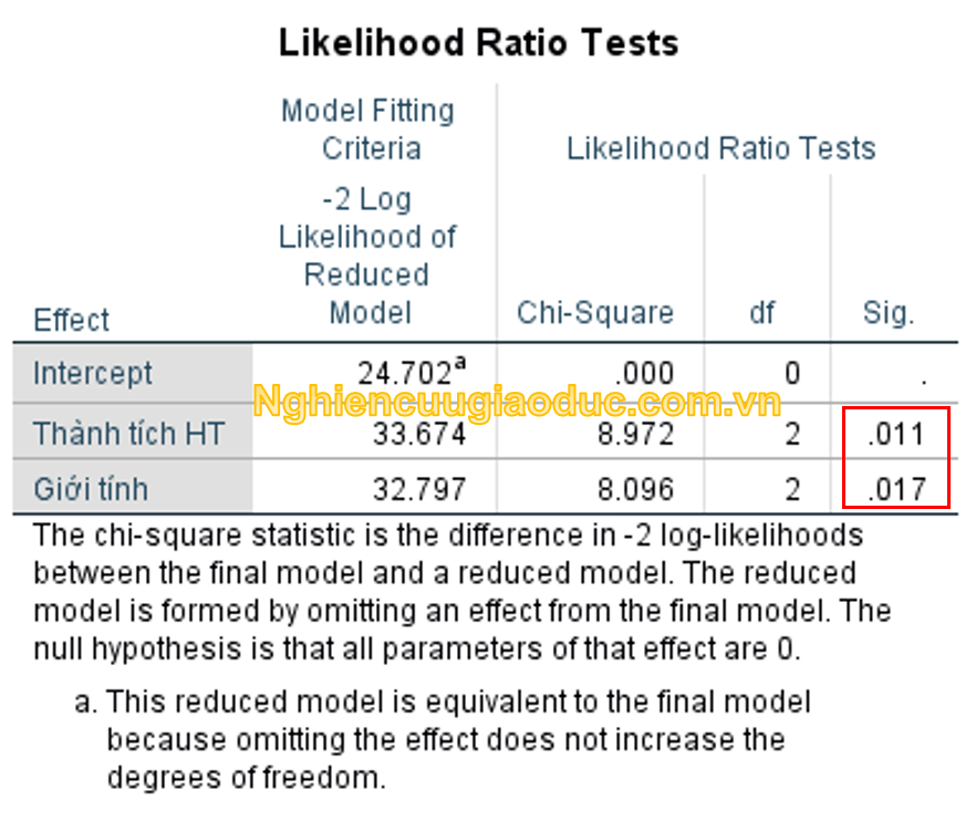 Một tùy chọn khác để kiểm tra thước đo tổng thể về mô hình là xem xét các thống kê được trình bày trong bảng Model Fitting Information. Hàng “Final” trình bày thông tin về việc liệu tất cả các hệ số của mô hình có bằng 0 hay không (tức là bất kỳ hệ số nào có ý nghĩa thống kê hay không). Một cách khác để diễn giải kết quả này là liệu các biến mà bạn đã thêm vào có cải thiện đáng kể về mặt thống kê so với một mình biến chặn hay không (tức là không có biến nào được thêm vào). Bạn có thể thấy giá trị cột “Sig.” rằng p = 0.003 < 0.05, có nghĩa là mô hình đầy đủ dự đoán có ý nghĩa thống kê về biến phụ thuộc tốt hơn so với mô hình chỉ một mình điểm chặn (intercept-only model).