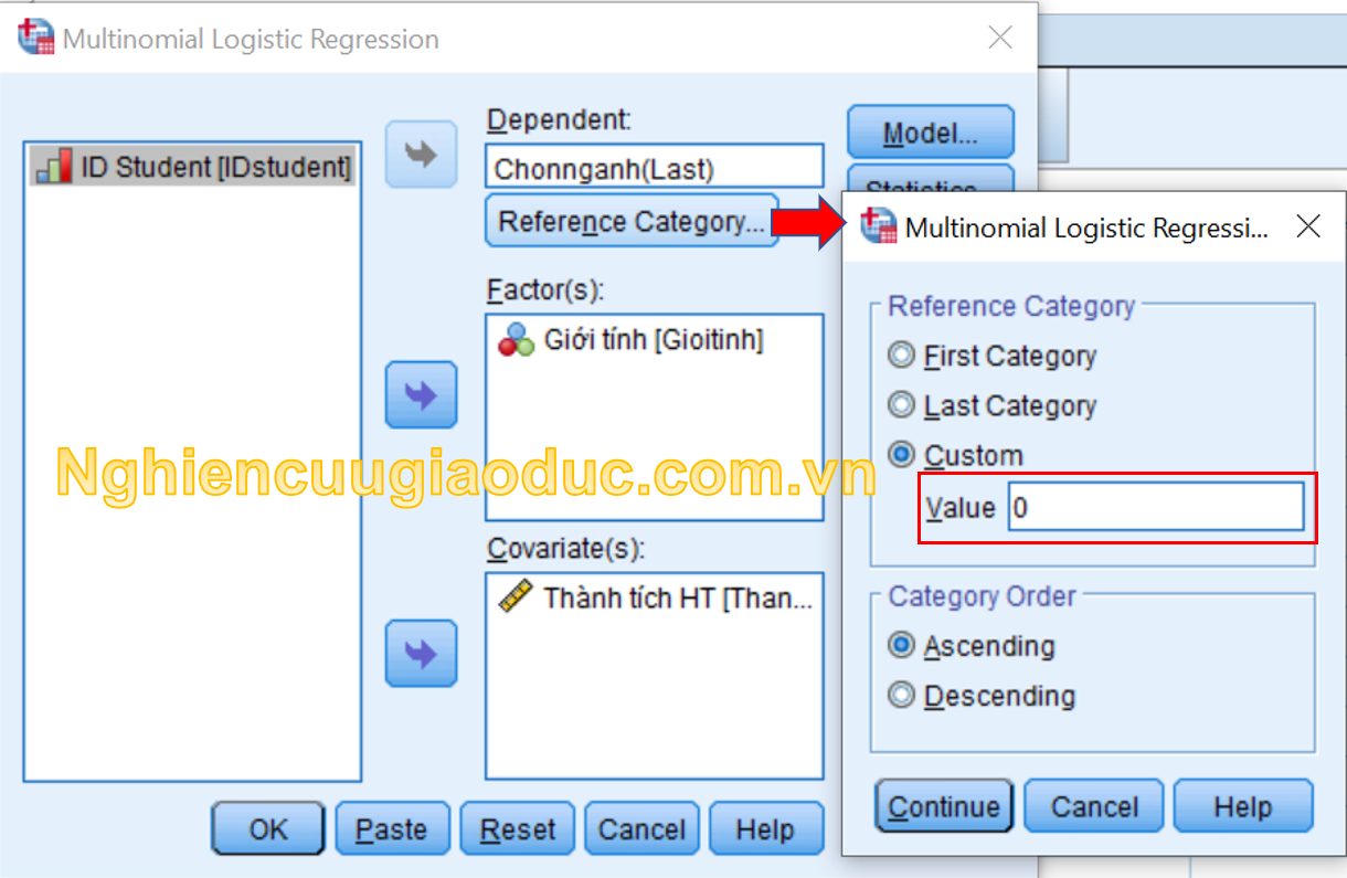Về ý tưởng, bảng Parameter Estimates là kết quả so sánh giữa nhóm Kỹ thuật, và nhóm Kinh tế với nhóm tham chiếu cơ sở là Ngoại ngữ. Việc chọn nhóm tham chiếu cơ sở nào là do mình tự quyết định. Cuối cùng, còn việc so sánh giữa nhóm ‘Kỹ thuật’ và nhóm ‘Kinh tế’ như thế nào. Lúc này ta cần thực hiện chạy lại hồi quy đa thức, với nhóm tham chiếu là nhóm ‘Kỹ thuật’ hoặc ‘Kinh tế’. Giả sử chọn nhóm tham chiếu là ‘Kỹ thuật’, lúc đó chương trình sẽ chạy ra lấy nhóm Kỹ thuật so với nhóm Kinh tế, và nhóm Kỹ thuật so với nhóm Ngoại ngữ. Việc chọn nhóm tham chiếu bằng cách nhấn nút Reference Category và điền vào số mình cần làm tham chiếu như trong hình (nhập giá trị 0 = Kỹ thuật).