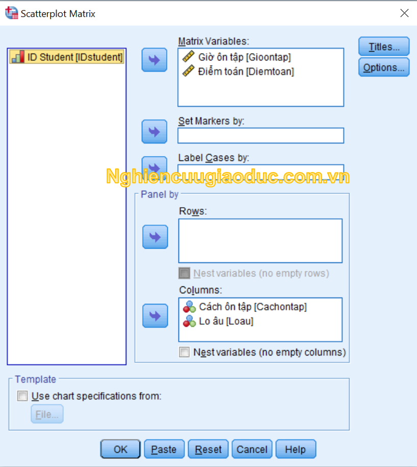 – Bước 2: Chuyển hiệp biến ‘Gioontap’ và biến phụ thuộc ‘Diemtoan’ vào ô Matrix Variables. Chuyển biến độc lập ‘Loau’ và ‘Cachontap’ vào ô Rows hoặc Columns.