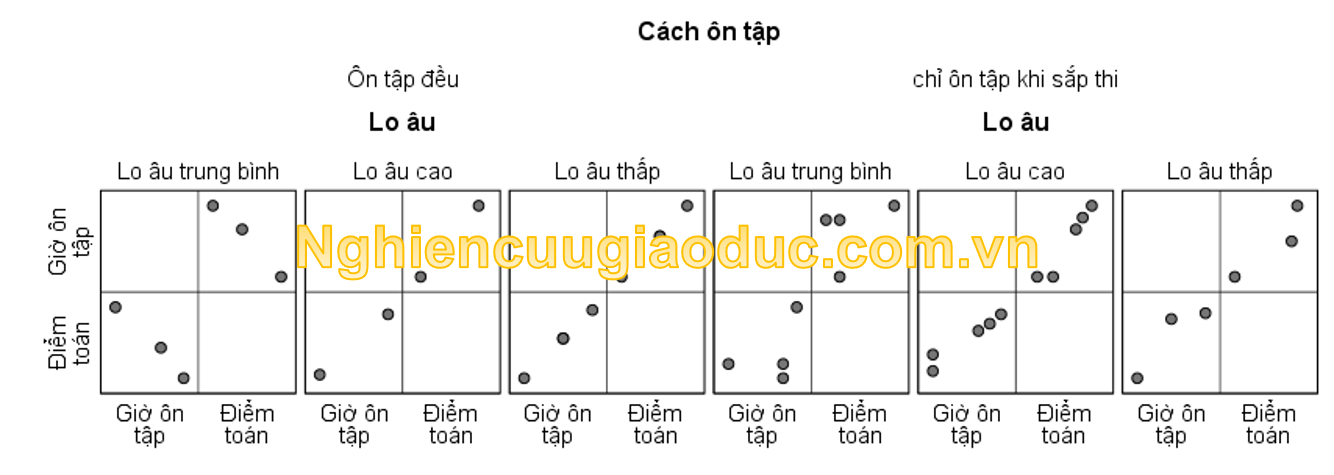 Các nhà nghiên cứu muốn biết: (a) liệu các mức độ lo lắng ảnh hưởng như thế nào đến thành tích thi toán của các sinh viên; và (b) liệu thành tích thi toán theo các mức độ lo âu khi kiểm tra có khác nhau hay không tùy thuộc vào thời lượng ôn tập được phân loại trong ‘ôn tập đều’ và ‘chỉ ôn tập khi sắp thi’. Mức ý nghĩa Alpha được chọn là 5%.