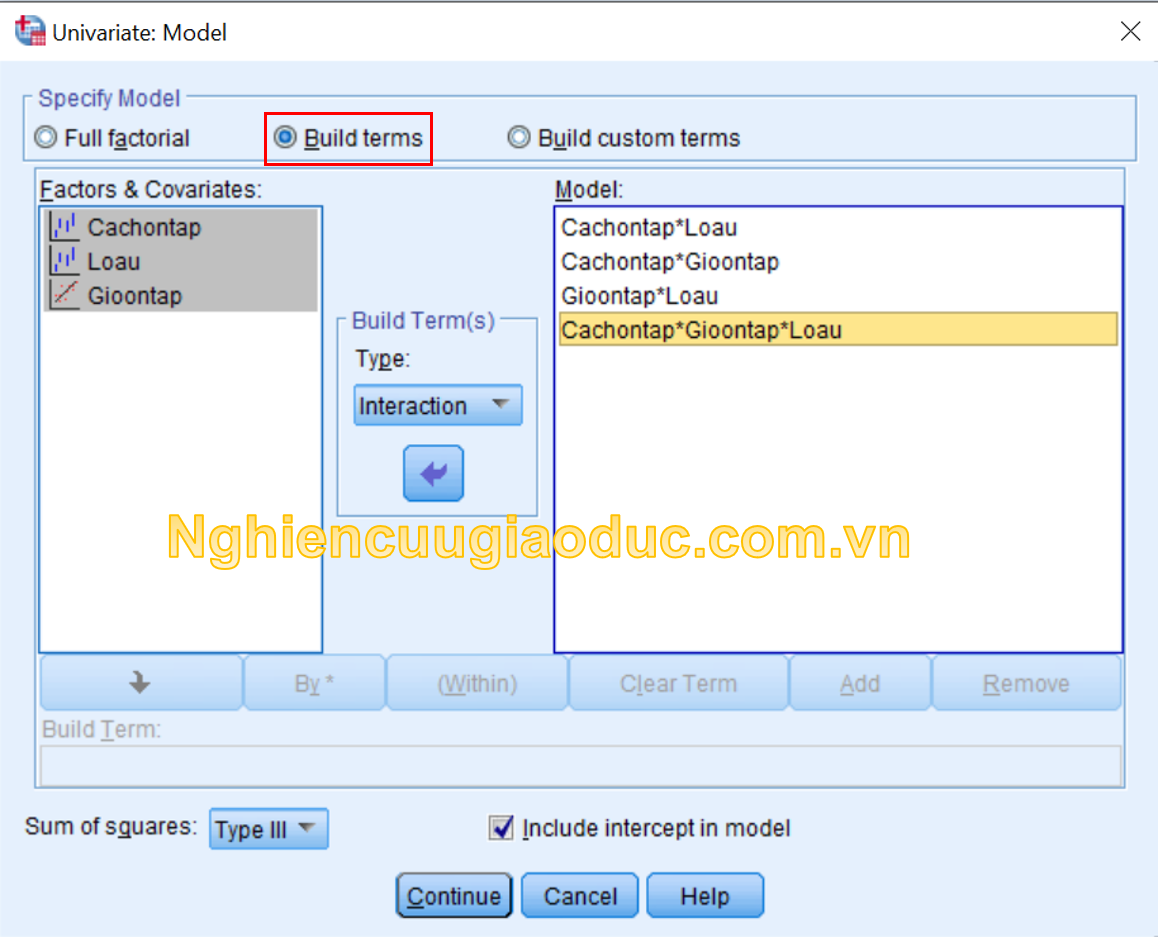 – Bước 3: Nhấp vào nút Model để mở hộp thoại Univariate: Model. Nhấp vào lựa chọn Build terms, sau đó chúng ta tạo ra các hiệu ứng tương tác gồm ‘Cachontap*Loau’, ‘Cachontap*Gioontap’, ‘Gioontap*Loau’, ‘Cachontap *Gioontap*Loau’ trong ô Model. Sau đó nhấp vào Continue.