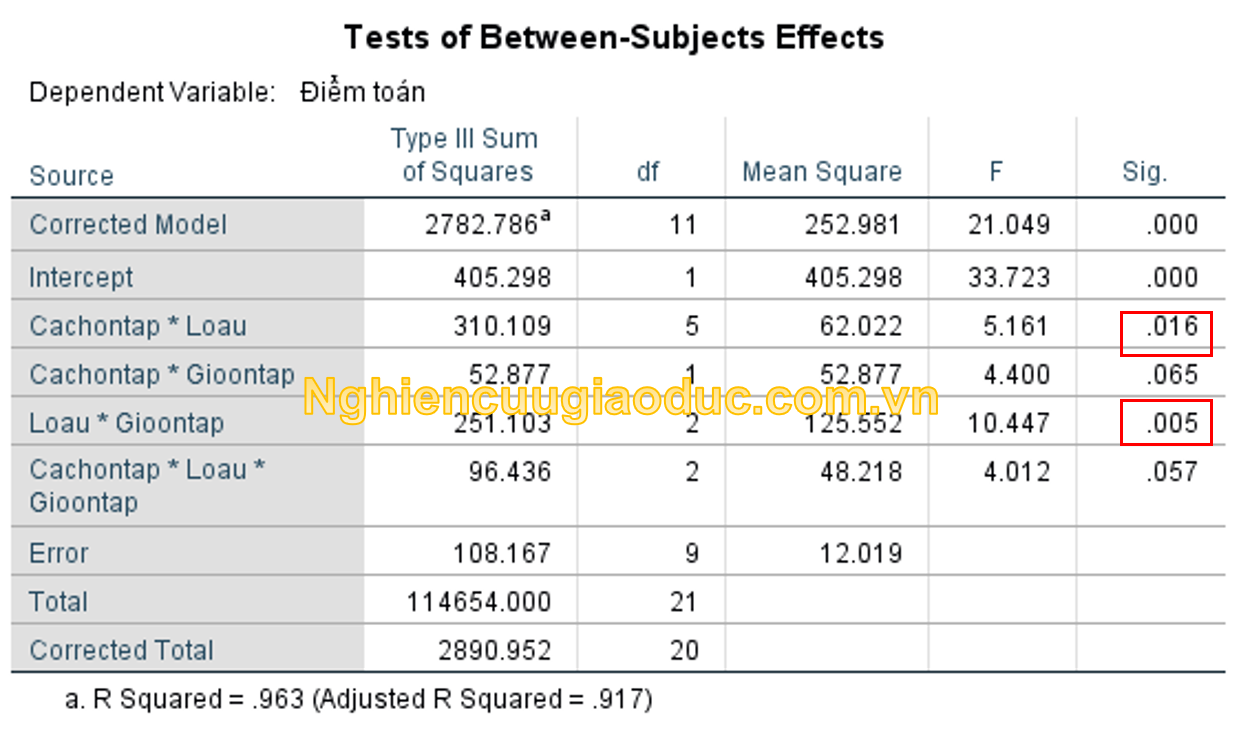 Kết quả trong bảng Test of Between-Subjects Effects, chúng ta kiểm tra giá trị tại hàng ‘Cachontap*Loau’, ‘Cachontap*Gioontap’, ‘Gioontap*Loau’, ‘Cachontap *Gioontap*Loau’ kết hợp cột ‘Sig.’ tức là các giá trị ‘p’. Kết quả cho thấy giá trị p-value tại các hàng ‘Cachontap*Loau’ và ‘Gioontap*Loau’ là có p < 0.05, tức là có ý nghĩa thống kê nên chúng ta bác bỏ giả thuyết vô hiệu, nghĩa là giả định về sự đồng nhất của độ dốc hồi quy là không được đáp ứng. Chúng ta không nên tiếp tục thực hiện phân tích ANCOVA hai chiều. Tuy nhiên, với tính chất minh họa thủ tục phân tích ANCOVA, chúng tôi vẫn tiếp tục thực hiện.