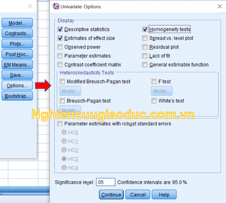 – Bước 5: Nhấp vào Options để mở hộp thoại Univariate: Options. Bạn chọn Descriptive statistics (để thống kê mô tả), Estimates of effect size (để ước lượng kích thước hiệu ứng), Homogeneity tests (để kiểm tra tính đồng nhất của phương sai). Sau đó nhấp vào Continue.