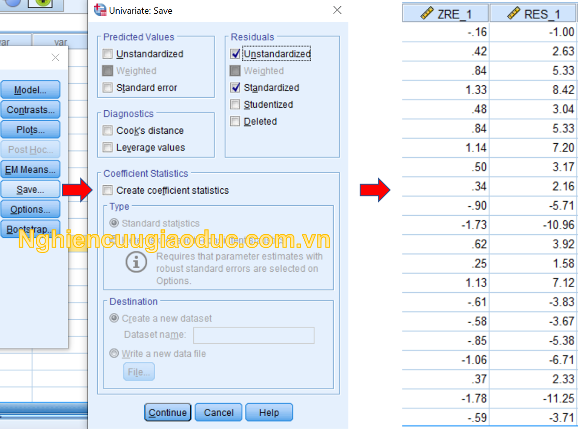 – Bước 6: Nhấp vào Save để mở hộp thoại Univariate: Save. Bạn chọn Unstandardized (để xuất dữ liệu phần dư chưa chuẩn hóa), Standardized (để xuất dữ liệu phần dư chuẩn hóa). Bạn sẽ sử dụng kết quả này để kiểm tra ‘giả định 5’ về tính chuẩn của phần dư cho mỗi danh mục biến độc lập. Bạn có thể vẽ biểu đồ dữ liệu chuẩn hóa hoặc chưa chuẩn hóa. Bảng dữ liệu của bạn sẽ xuất hiện thêm các cột dữ liệu ‘ZRE_1’ (dữ liệu phần dư chuẩn hóa) và ‘RES_1’(dữ liệu phần dư chưa chuẩn hóa). Sau đó nhấp vào Continue.