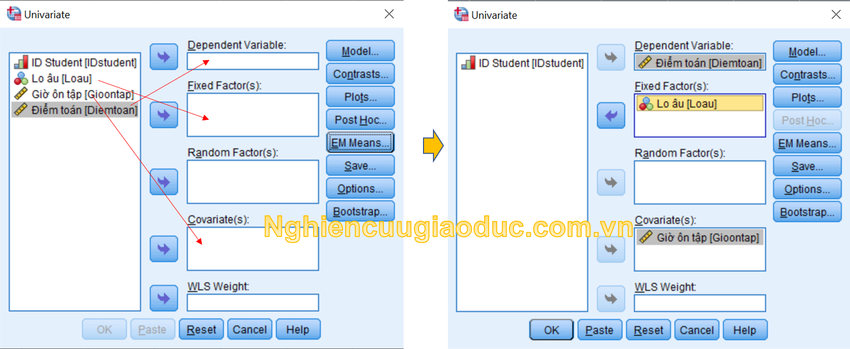 – Bước 2: Trong hội thoại Univariate, bạn chuyển biến phụ thuộc ‘Diemtoan’ vào ô Dependent Variables; chuyển biến độc lập ‘Loau’ vào ô Fixed Factor(s); chuyển hiệp biến ‘Gioontap’ vào ô Covariate.