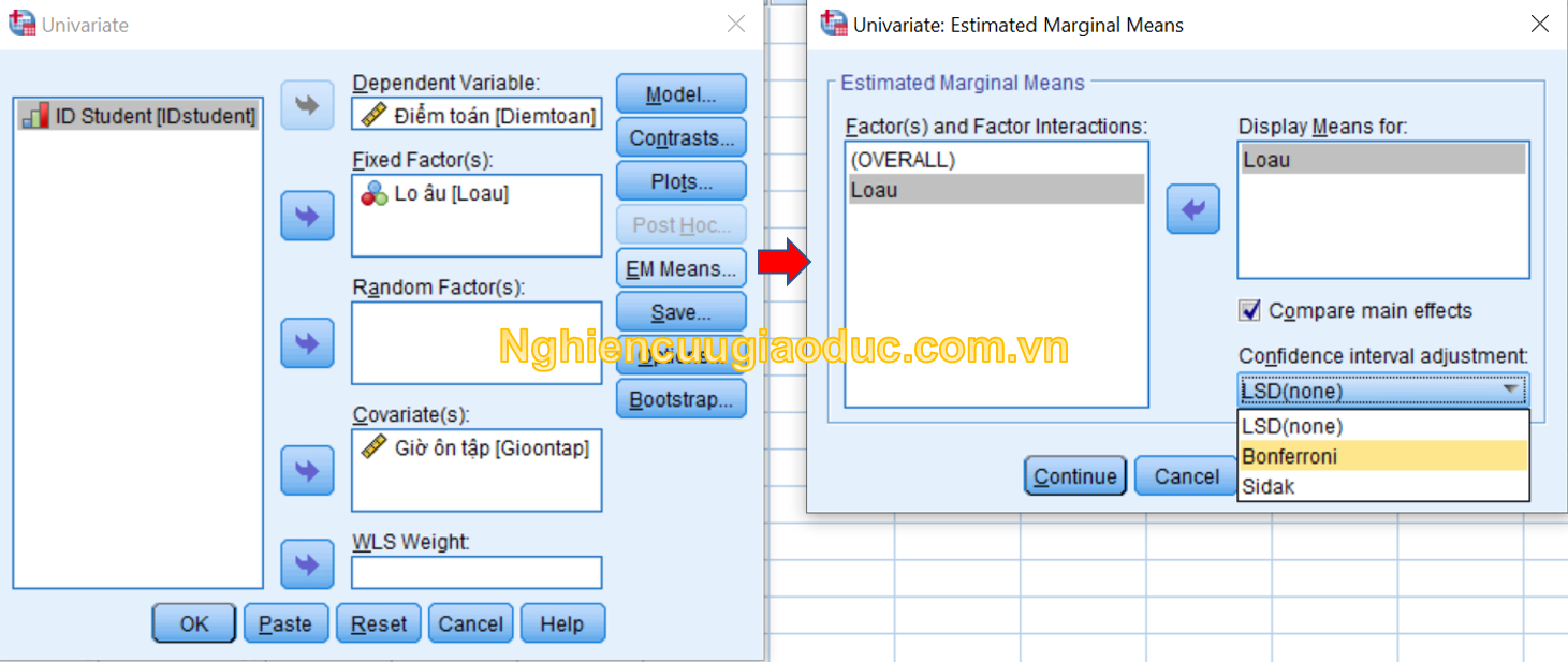 – Bước 3: Nhấp vào nút EM Means để mở hộp thoại Univariate: Estimated Marginal Means. Chúng ta chuyển biến độc lập ‘Loau’ vào hộp Display Means for. Nhấp vào ô Compare main effects, chọn Bonferroni trong danh sách chọn Confidence interval adjustment. Điều này giúp chúng ta có thể thêm các t-test từng cặp (pairwise t-tests) để so sánh các trung bình cận biên. Điều chỉnh Bonferroni hiệu chỉnh các bậc tự do để tính cho nhiều phép thử theo cặp. Sau đó nhấp Continue.