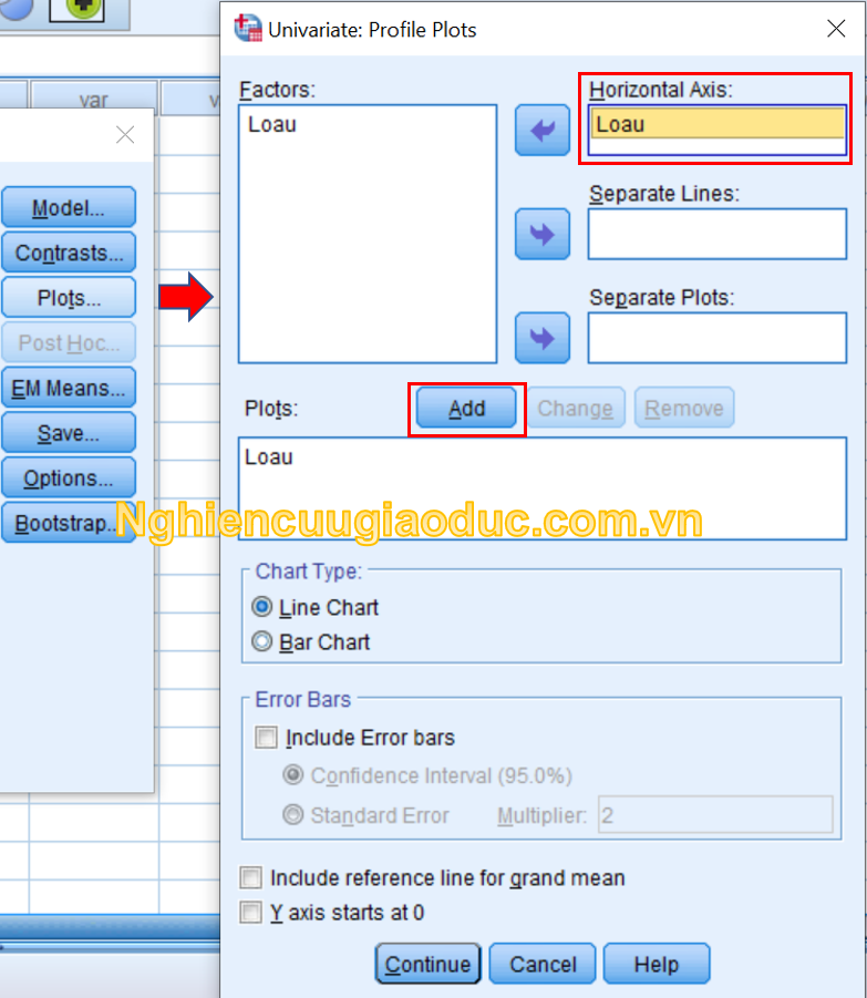 – Bước 4: Nhấp vào Plots để mở hộp thoại Multivariate: Profile Plots. Chúng ta chuyển biến độc lập ‘Loau vào ô Horizontal Axis. Tiếp theo nhấp vào Add để thêm biến vào trong vùng Plots. Sau đó nhấp vào Continue.