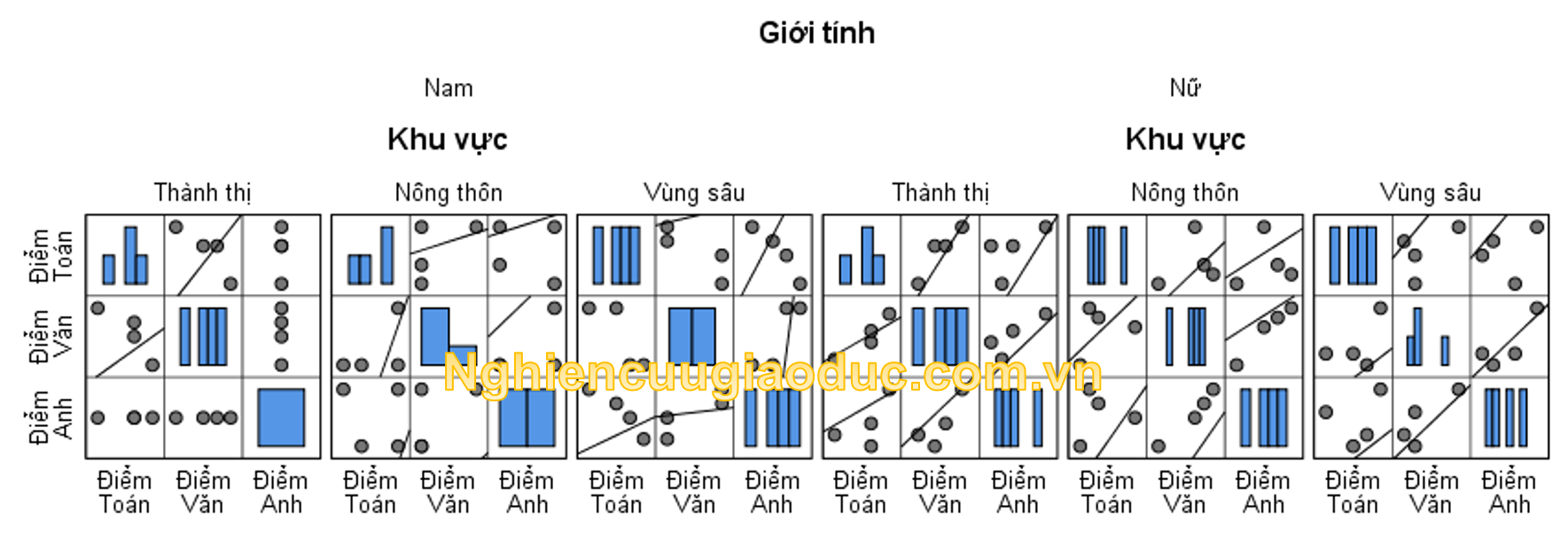 a) Để kiểm tra giả định 7 về mối quan hệ tuyến tính giữa từng cặp biến phụ thuộc cho mỗi nhóm của biến độc lập, bạn có thể kiểm tra giả định này bằng cách vẽ một đồ thị ma trận phân tán (vui lòng đọc bài đồ thị ma trận phân tán và vẽ đồ thị với ba biến Điểm Toán, Điểm Văn và Điểm Anh cho mỗi nhóm của biến độc lập). Kết quả thu được như hình dưới đây: