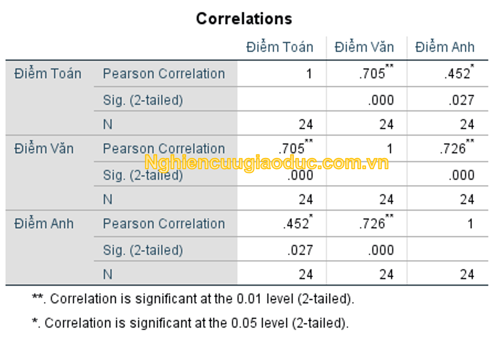 b) Để kiểm tra giả định 9 rằng không có đa cộng tuyến giữa các biến phụ thuộc, bạn vui lòng đọc bài Phân tích tương quan Pearson. Kết quả phân tích tương quan Pearson cho ba biến Điểm Toán, Điểm Văn, Điểm Anh được thể hiện trong bảng dưới đây: